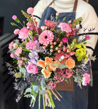 Bukiet wykonujemy z mieszanych sezonowych kwiatów głównie w fioletowo-różowej kolorystyce. Oprócz głównych odcieni fuksji czy maliny – do bukietu poddajemy inne pasujące kolory kwiatów. Gatunki i ilości używanych roślin wybiera konkretnie Florysta tworzący bukiet, dzięki temu macie pewność, że otrzymacie świeże, piękne i sezonowe kwiaty. 💗