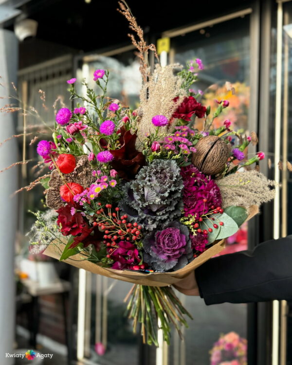Bukiet “Jesienny” wykonujemy każdorazowo na indywidualne zamówienie. W skład kompozycji wchodzą różne rodzaje kwiatów, zieleni i dodatków. Florysta tworzący kompozycję samodzielnie dobiera odpowiedni skład i kolorystykę bukietu. 💐