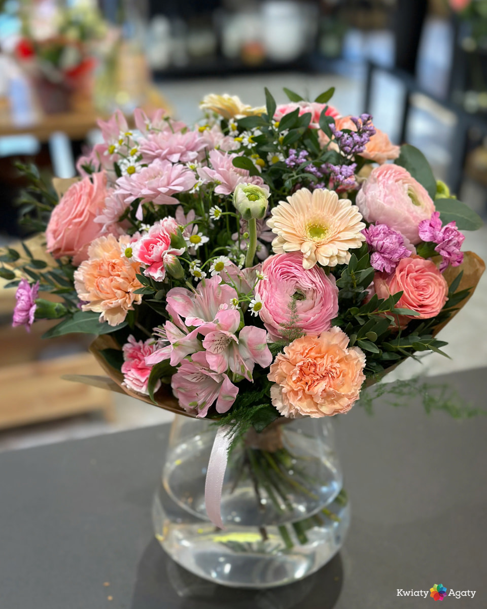 Bukiet skomponowany został tak, aby podkreślić piękne wiosenne kolory. Kwiaty w różnych gatunkach i odcieniach pięknie wyglądają z dodatkami i żywą zielenią.