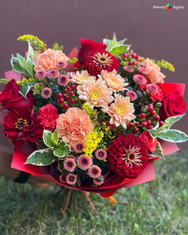 Bukiet kwiatów w czerwono – pomarańczowej kolorystyce to idealny pomysł na prezent zarówno dla kobiety jak i mężczyzny.