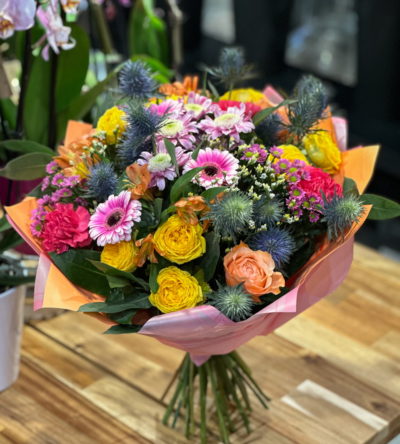 Bukiet kolorowych sezonowych kwiatów z efektem “roztrzepania”, które Florysta samodzielnie dobiera przy układaniu. Dzięki temu zawsze macie pewność, że w kompozycji znajdą się piękne, świeże rośliny. 🌸