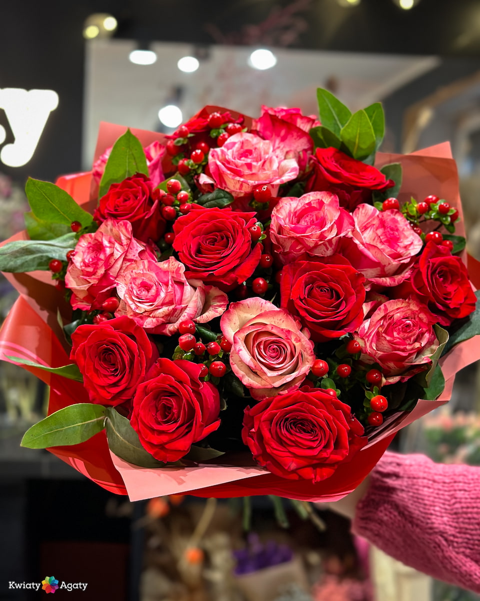 Nasz bukiet „Wyznanie” to kwintesencja elegancji i florystycznego kunsztu. Połączenie czerwonych i różowych róż tworzy harmonijną, a zarazem pełną piękna kompozycję, która idealnie wyraża uczucia. Dzięki zastosowaniu ozdobnej kryzy lub papieru, bukiet zyskuje nowoczesny, luksusowy charakter. 🌷✨