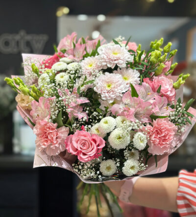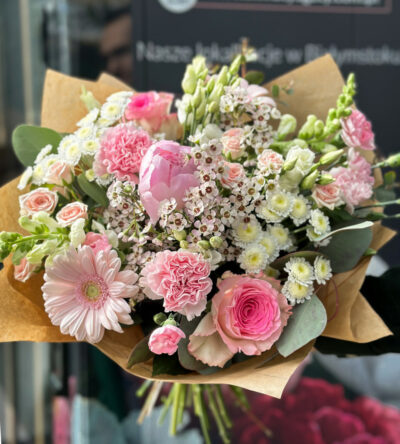 Przedstawione zdjęcia służą jako przykład zamawianej kompozycji. Kwiaty to elementy naturalne – które zależnie od pory mogą różnić się wielkością, formą czy wyglądem. Czasami różowe róże są jasne, czasami ciemniejsze, a innym razem z obwódką. Jeśli danego dnia kwiaciarnia będzie miała problem ze zdobyciem odpowiedniej ilości róż w wybranej długości – to skontaktuje się w celu ustalenia rozwiązania.