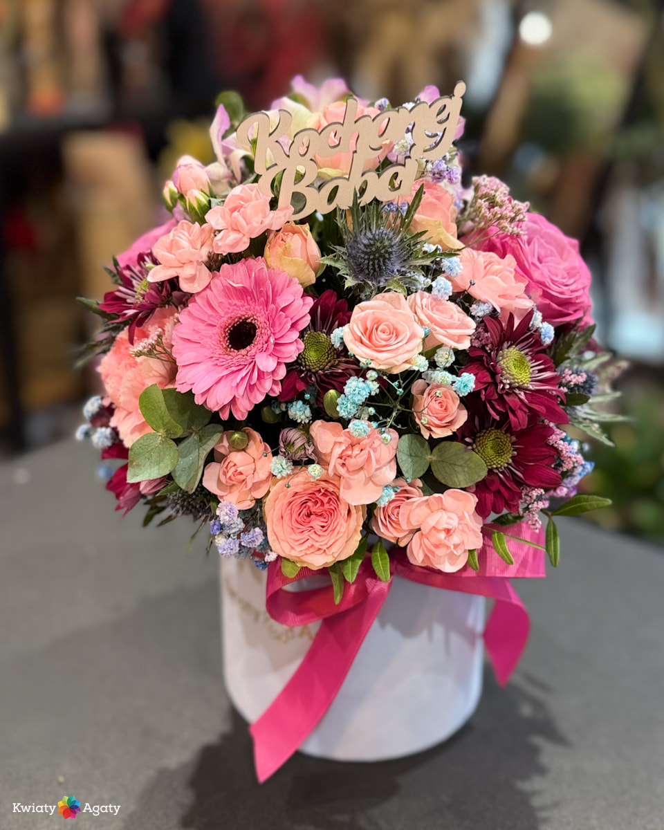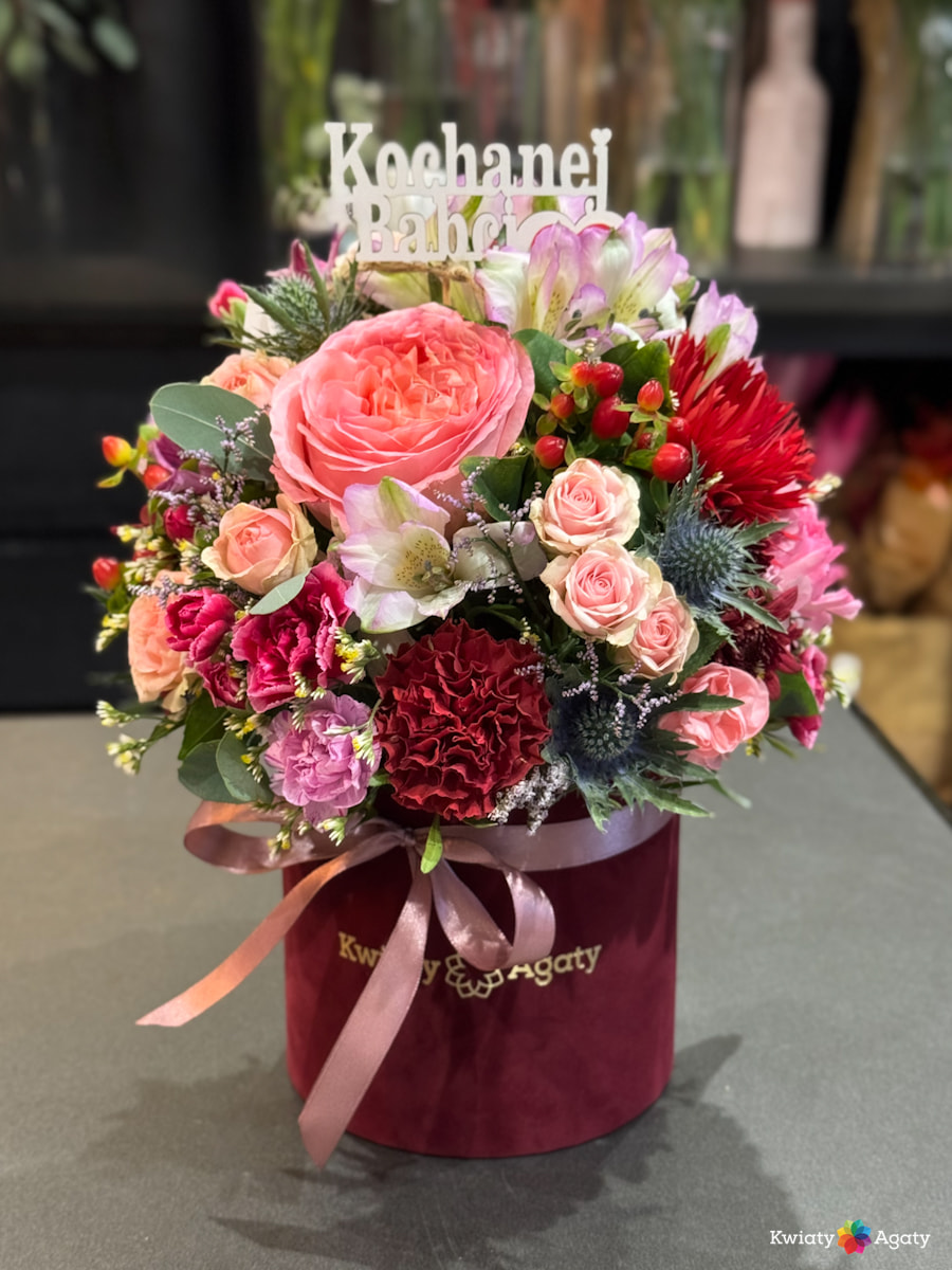 Przedstawione zdjęcia służą jako przykład zamawianej kompozycji. Kwiaty to elementy naturalne – które zależnie od pory mogą różnić się wielkością, formą czy wyglądem. Rozmiar pudełka również został podany dla przybliżenia wielkości, w rzeczywistości może się delikatnie różnić.