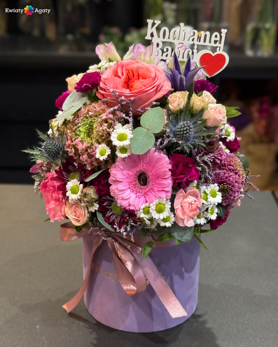 Flowerbox składa się z kolorowych lub pastelowych mieszanych kwiatów (samie wybieracie przy zakupie). Składu kwiatów, kolorystyki kompozycji i pudełka dokonuje florysta, który wykonuje kompozycję. Dzięki temu, możesz mieć pewność, że dostarczone kwiaty w pudełku będą pięknym podarunkiem, złożonym ze świeżych roślin i dodatków. Kolorystyka na zdjęciach jest jedynie przykładowa, zależy od dostępności kwiatów. 🌸