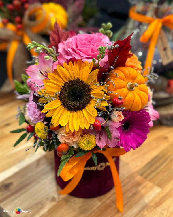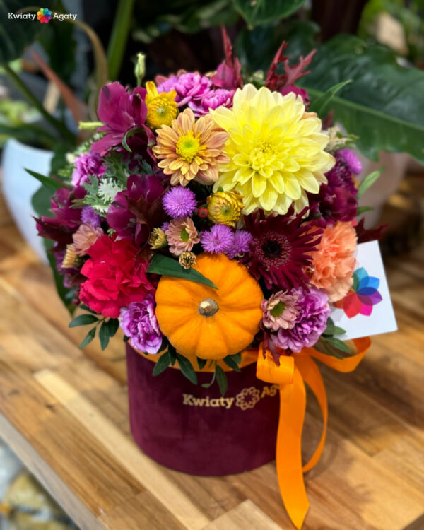 W kompozycji mogą występować bardzo różne kolory, od żółtego, pomarańczowego po fiolety i borda. Staramy się, aby każdy nasz box był inny i wyjątkowy. 🧡