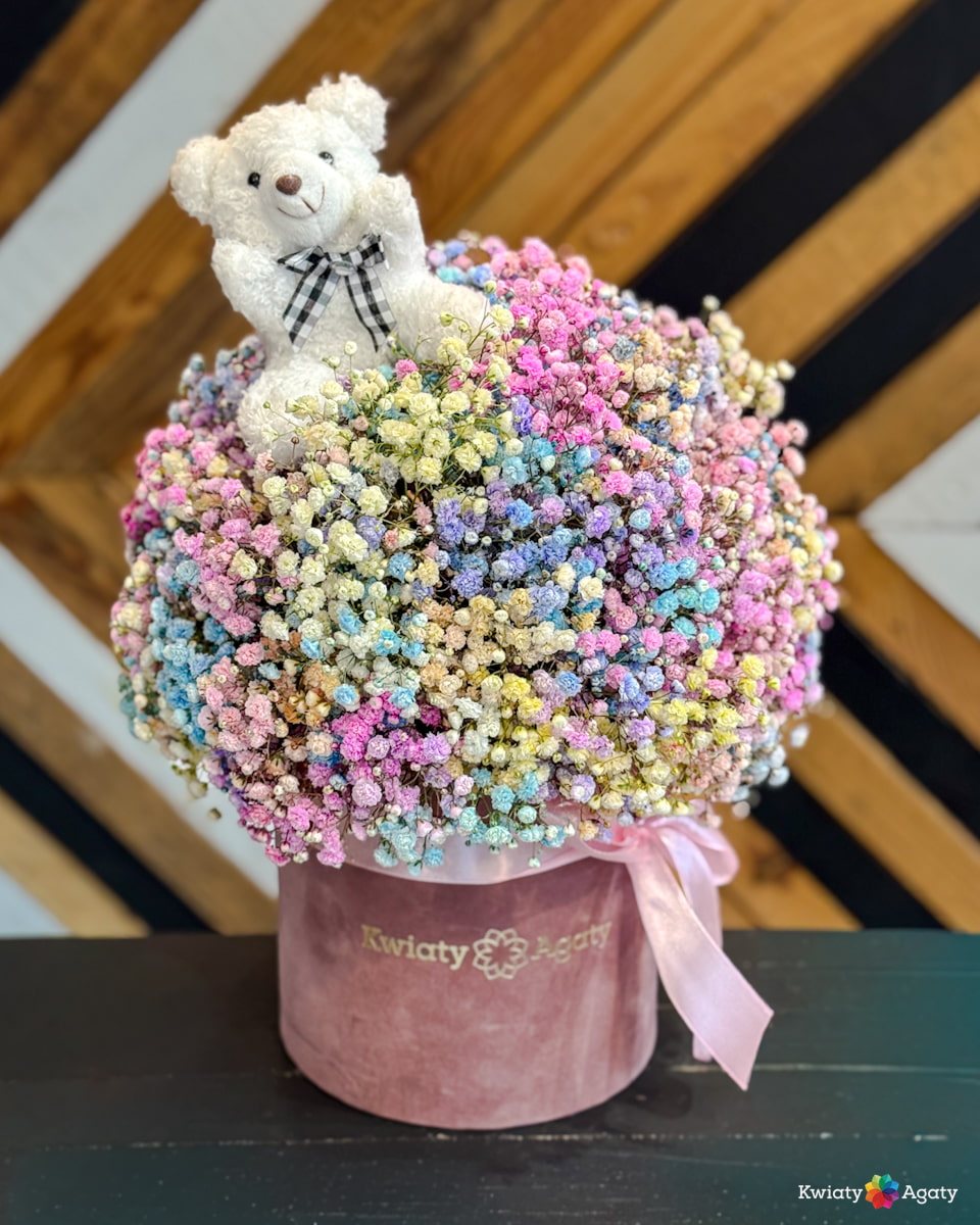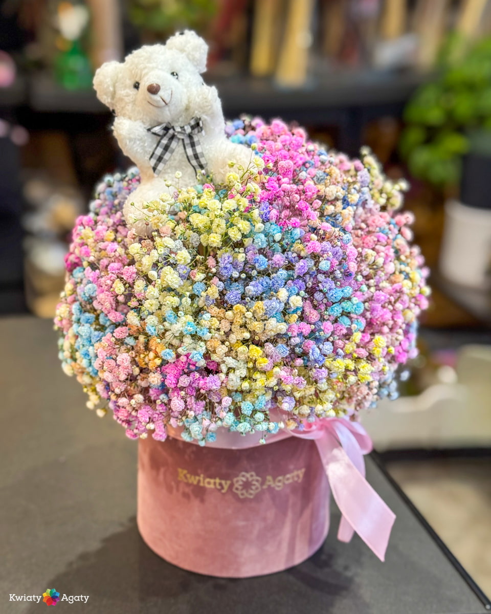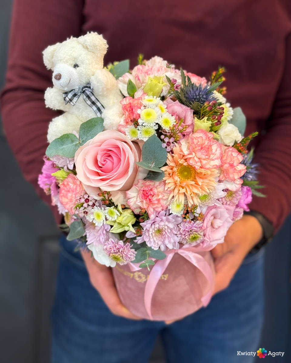 Ważne: Kwiaty to produkty naturalne, dlatego ich odmiany czy wielkość pąków mogą się różnić w zależności od pory roku i dostawy. Kolor pudełka oraz kolor i rodzaj misia wybierany jest losowo przez florystę (na ostatnim zdjęciu prezentujemy przykładowe rodzaje misiów, jakie posiadamy w ofercie). Zawsze dbamy jednak o to, by całość zachwycała wybraną przez Ciebie kolorystyką kwiatów. Zdjęcia traktuj jako inspirację do tego, co dla Ciebie stworzymy. 🌿